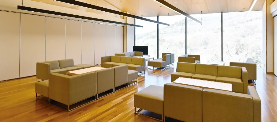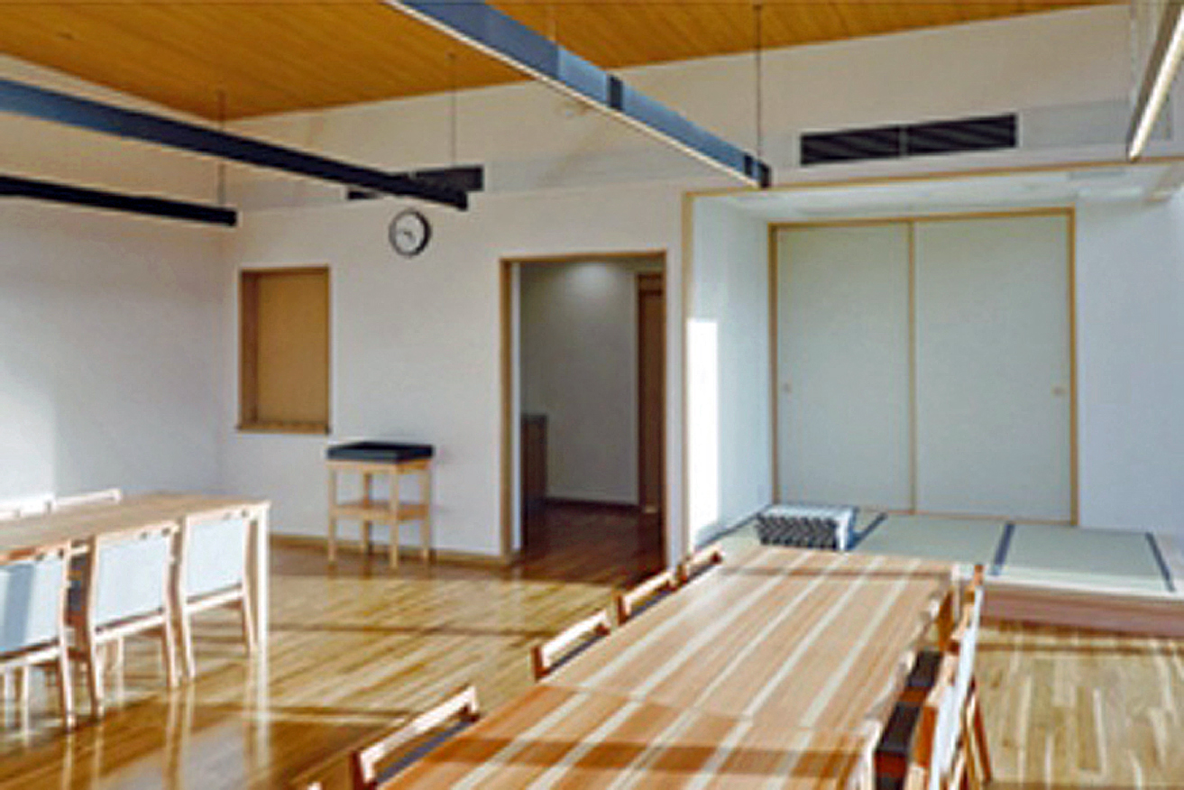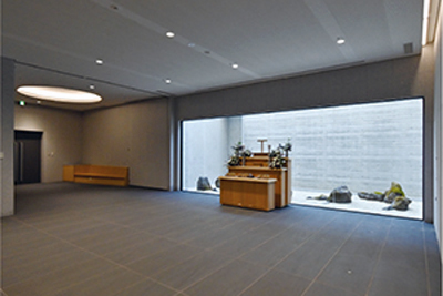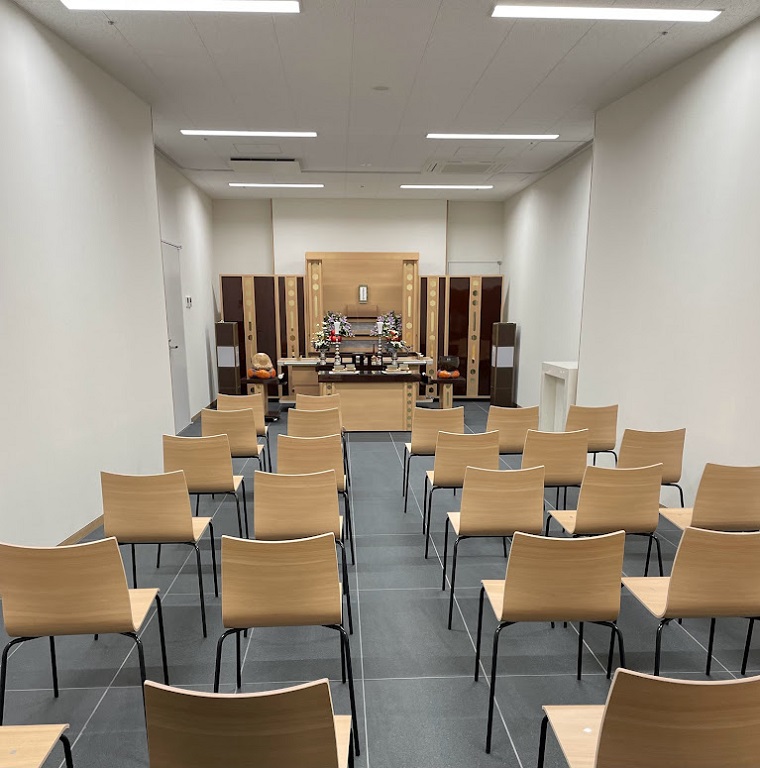 建物中央には多目的室(式場)が小規模なお葬式、直葬などのお別れの場所として利用できます。20人程座れる広さの式場です。夜間利用できないのでお通夜は出来ません。